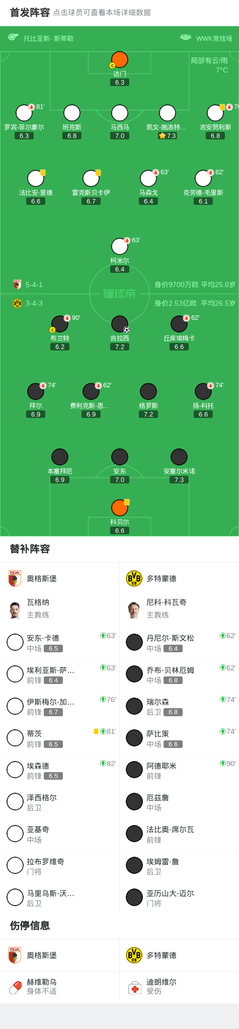 第71分钟,奥格斯堡获得良机,但乔林-贝林厄姆做出关键封堵